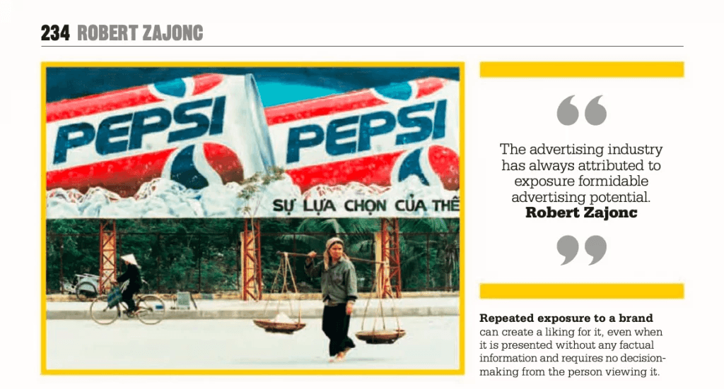This idea points out that without any powerful fancy copywriting words that invite people to buy something, just being always in the eyes of people, we can help them remember us well, and can create a liking for it.