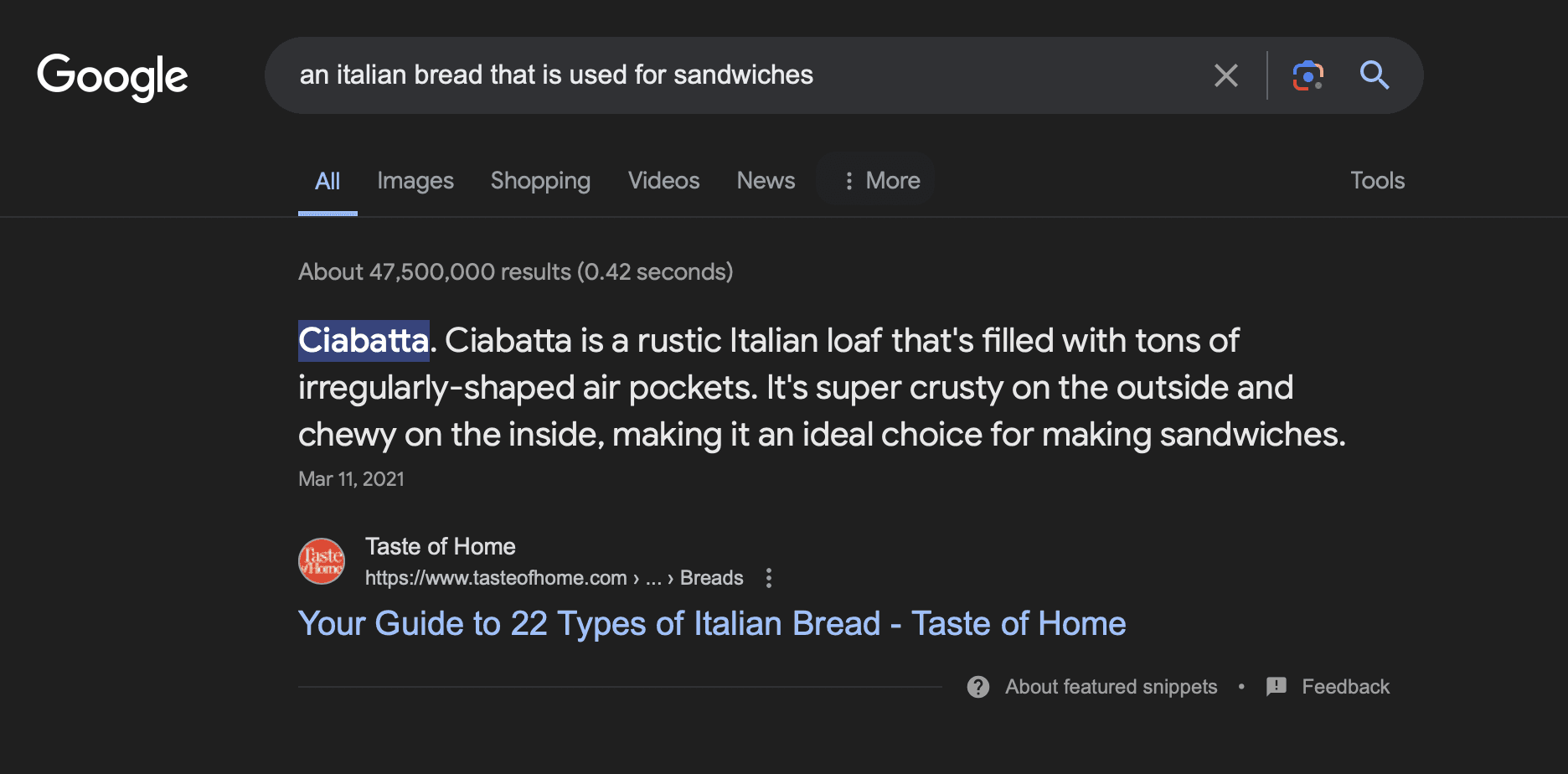 I knew ciabatta would appear in the results. By looking at the entire context of the ranked article and my intent, Google understood what I was looking for; my intention was finding informational article.